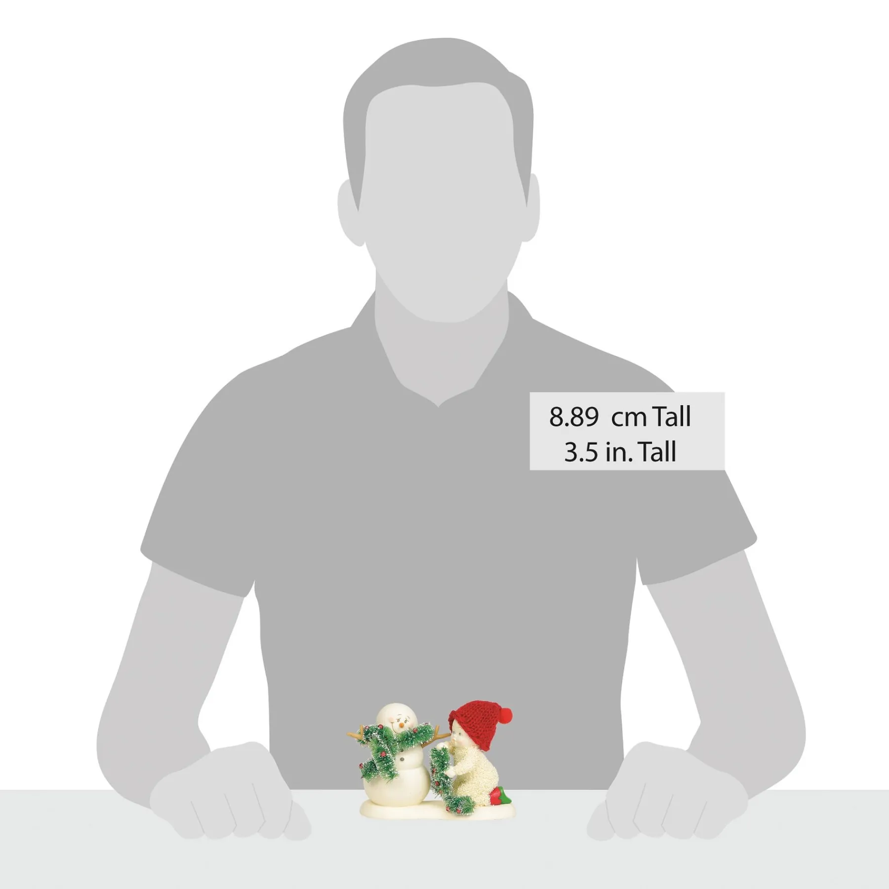 This Snowbaby dresses a bashful snowman in an ornamented garland. Together the pair don their gay apparel warmly.