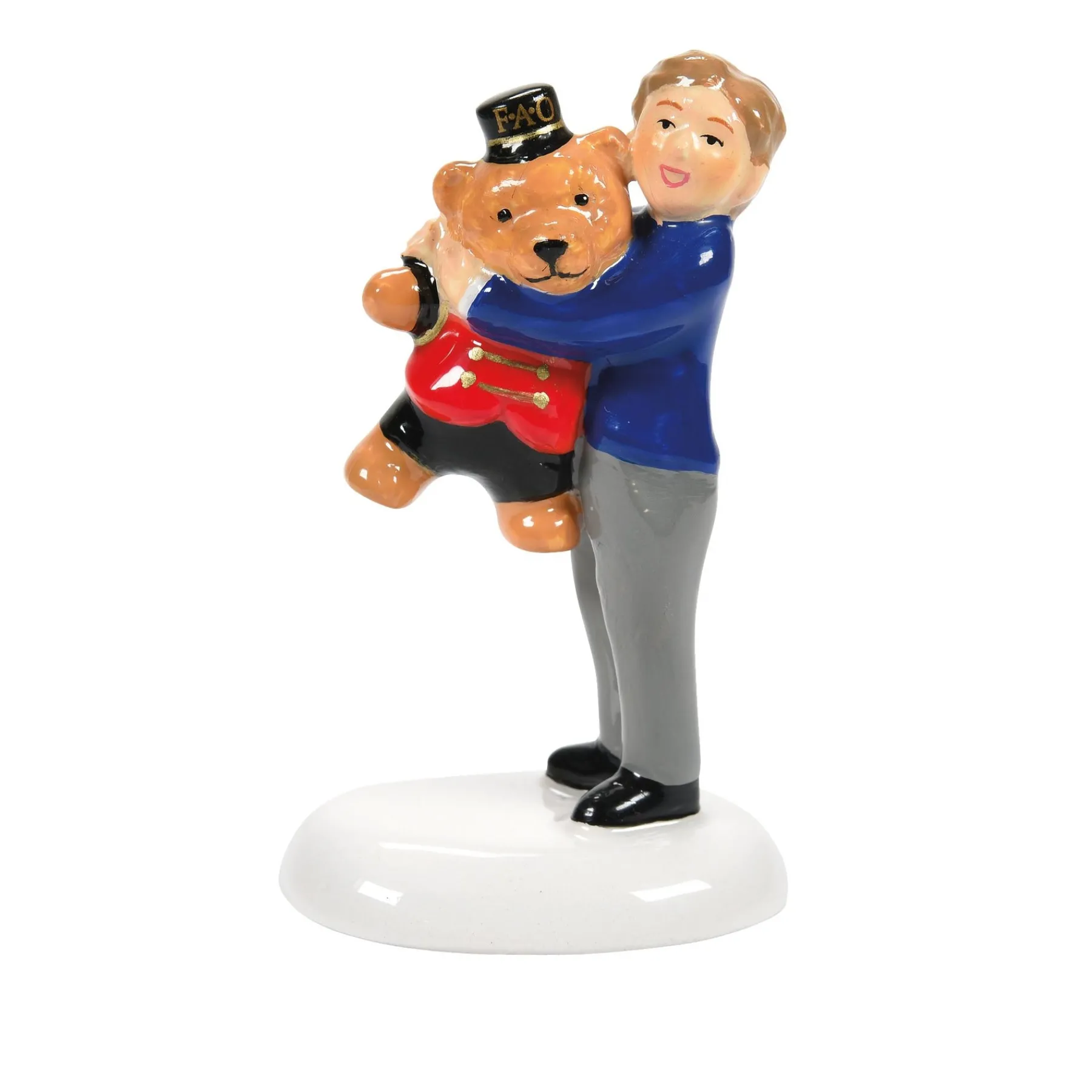 This happy youngster hugs a new friend, an FAO Schwarz teddy bear wearing the signature toy soldier uniform.