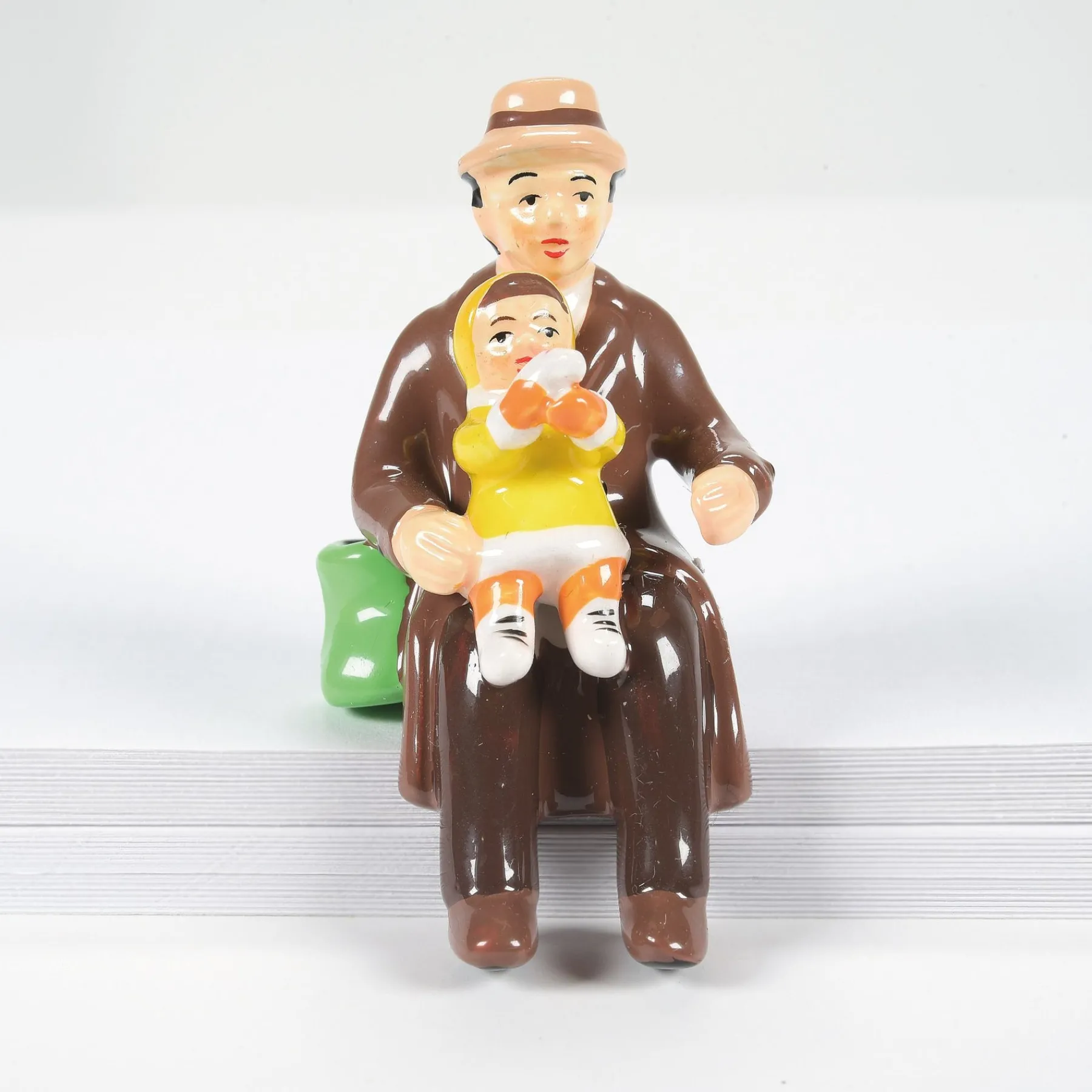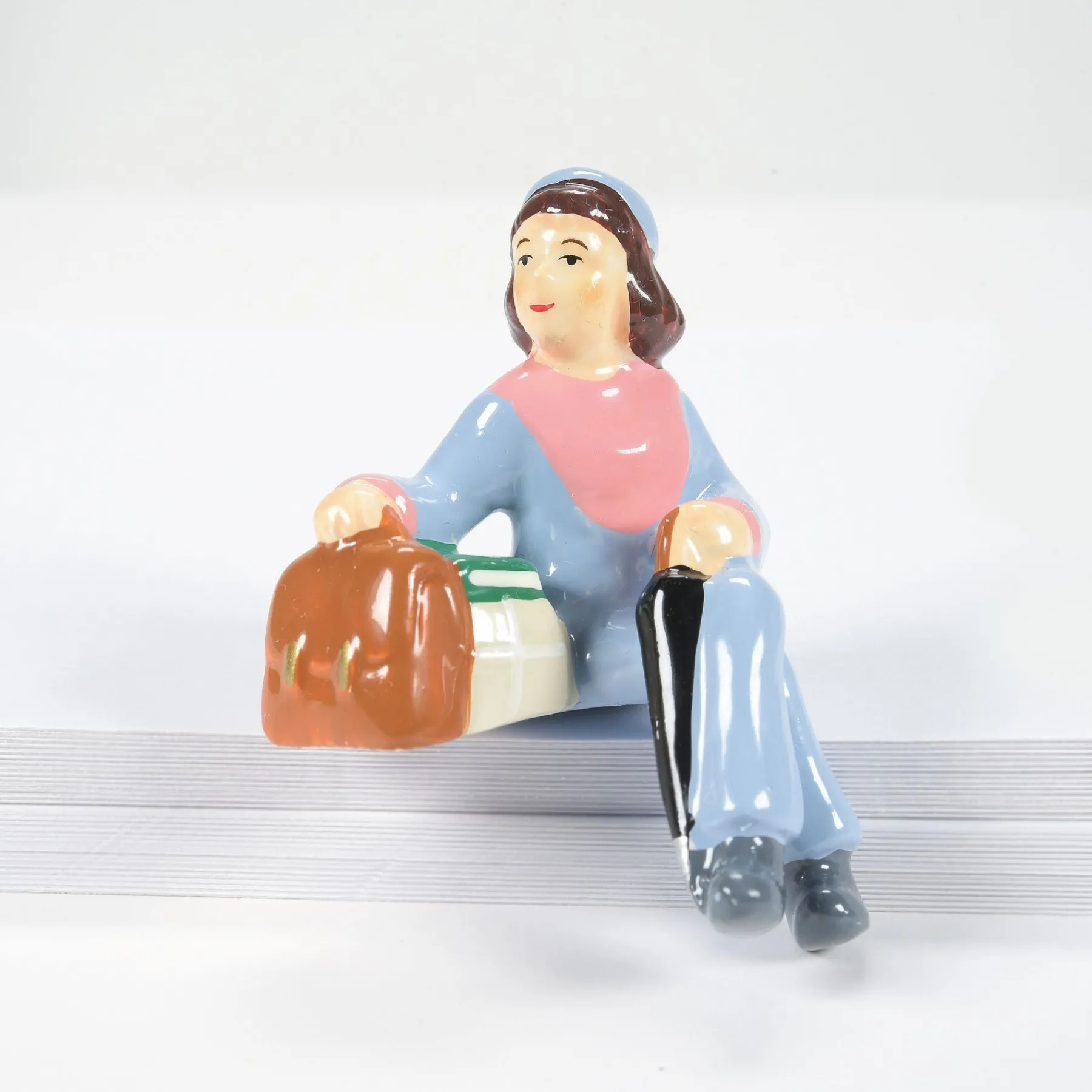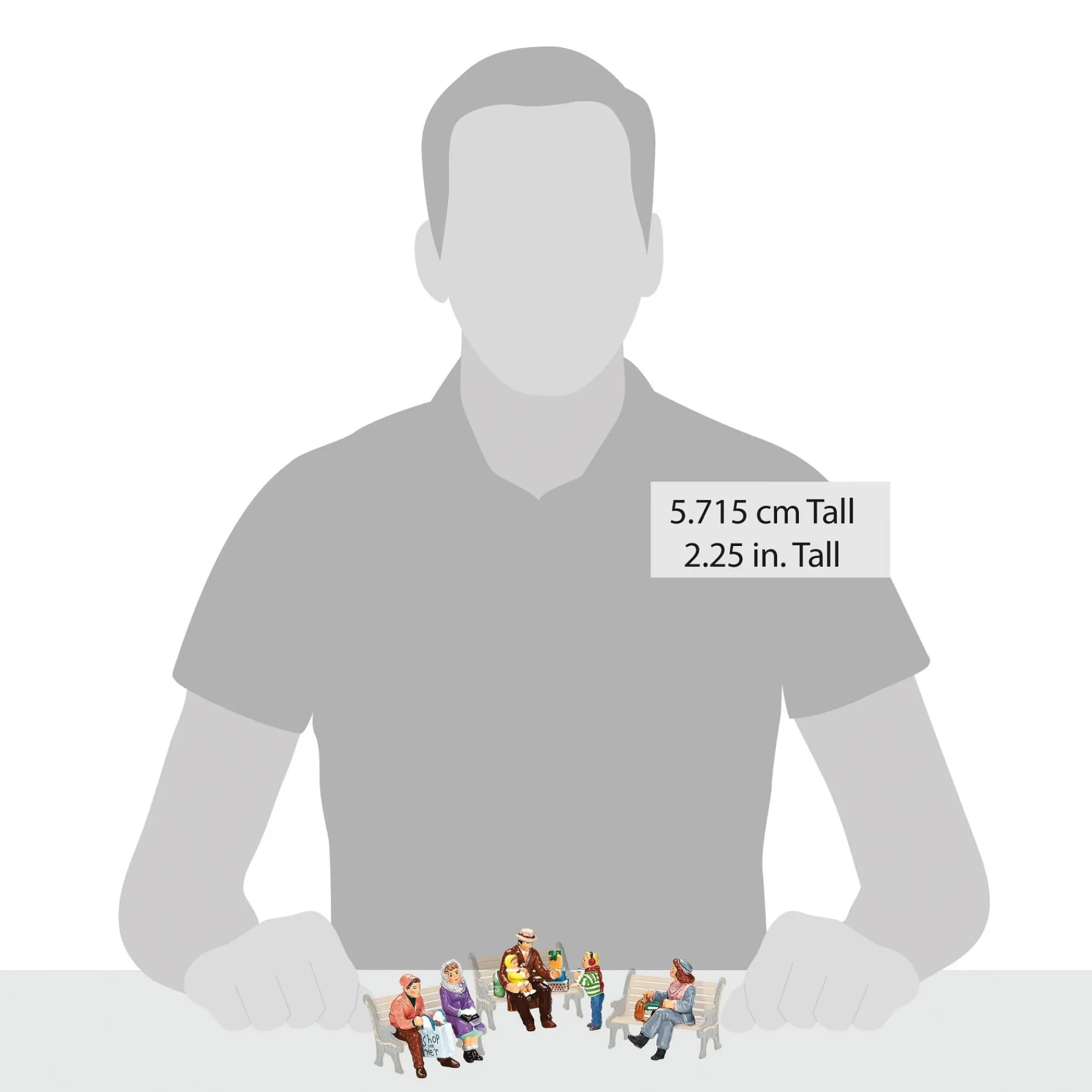 A variety of townspeople all in a seated position to use on park benches or sitting on a low wall. These folks are resting, talking or watching children play.