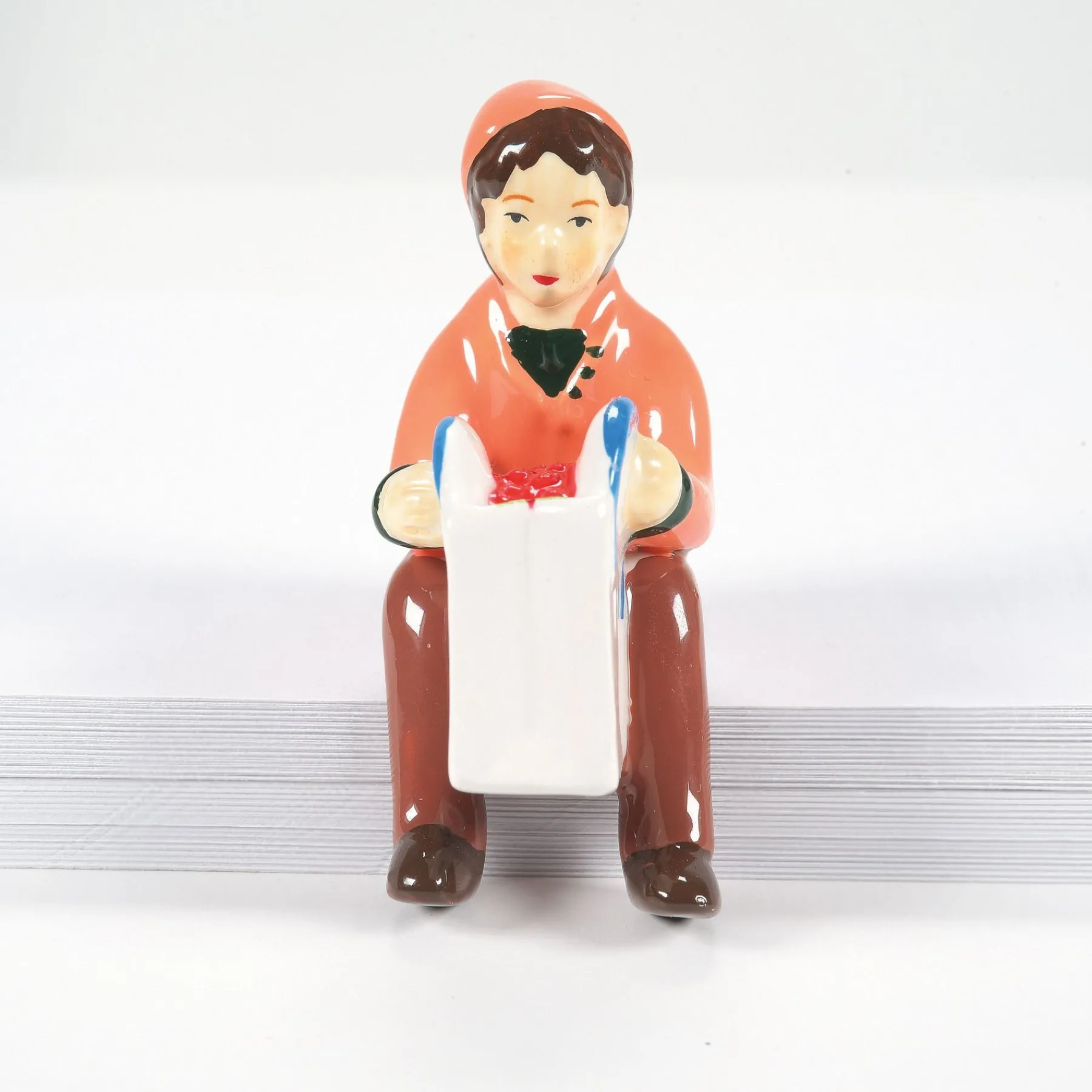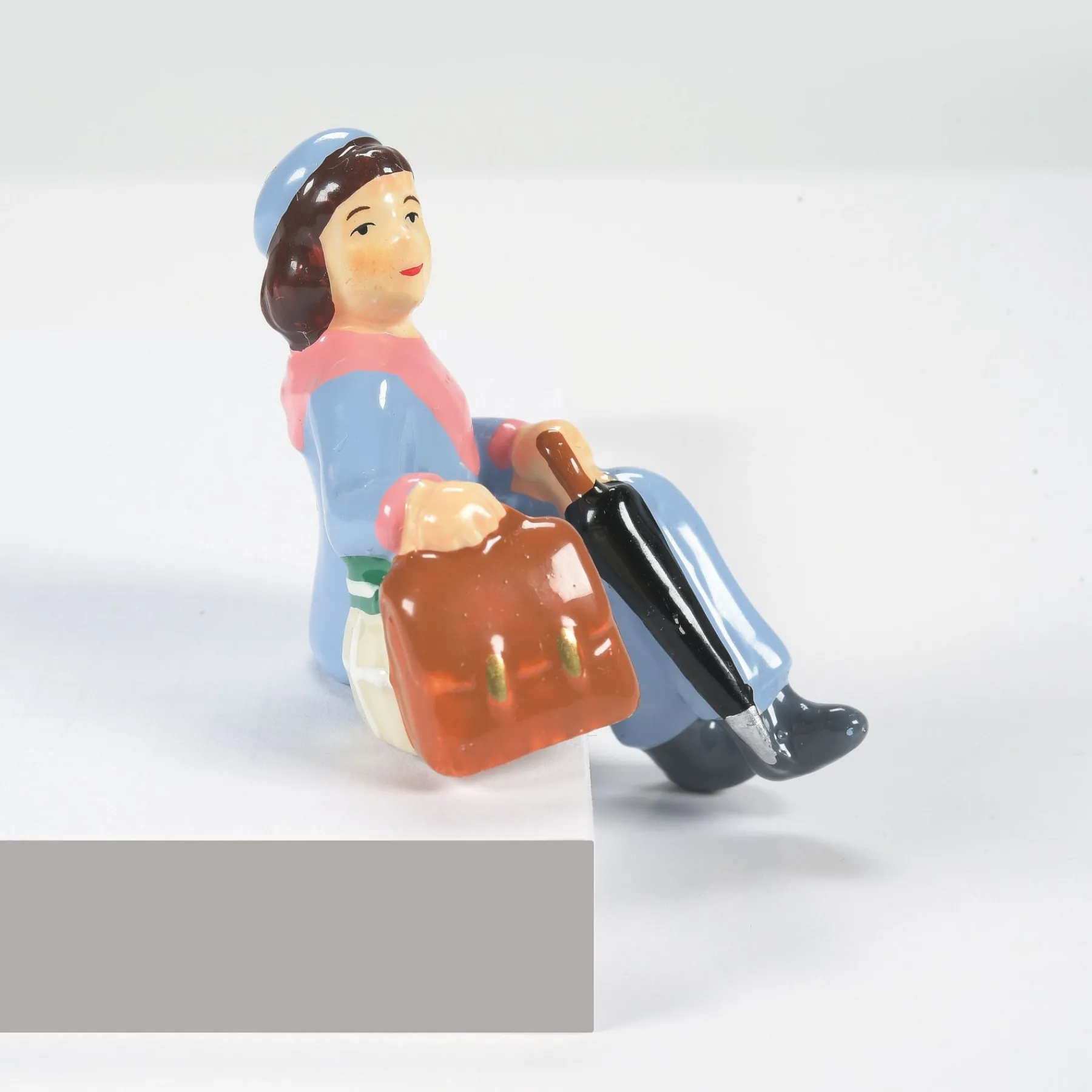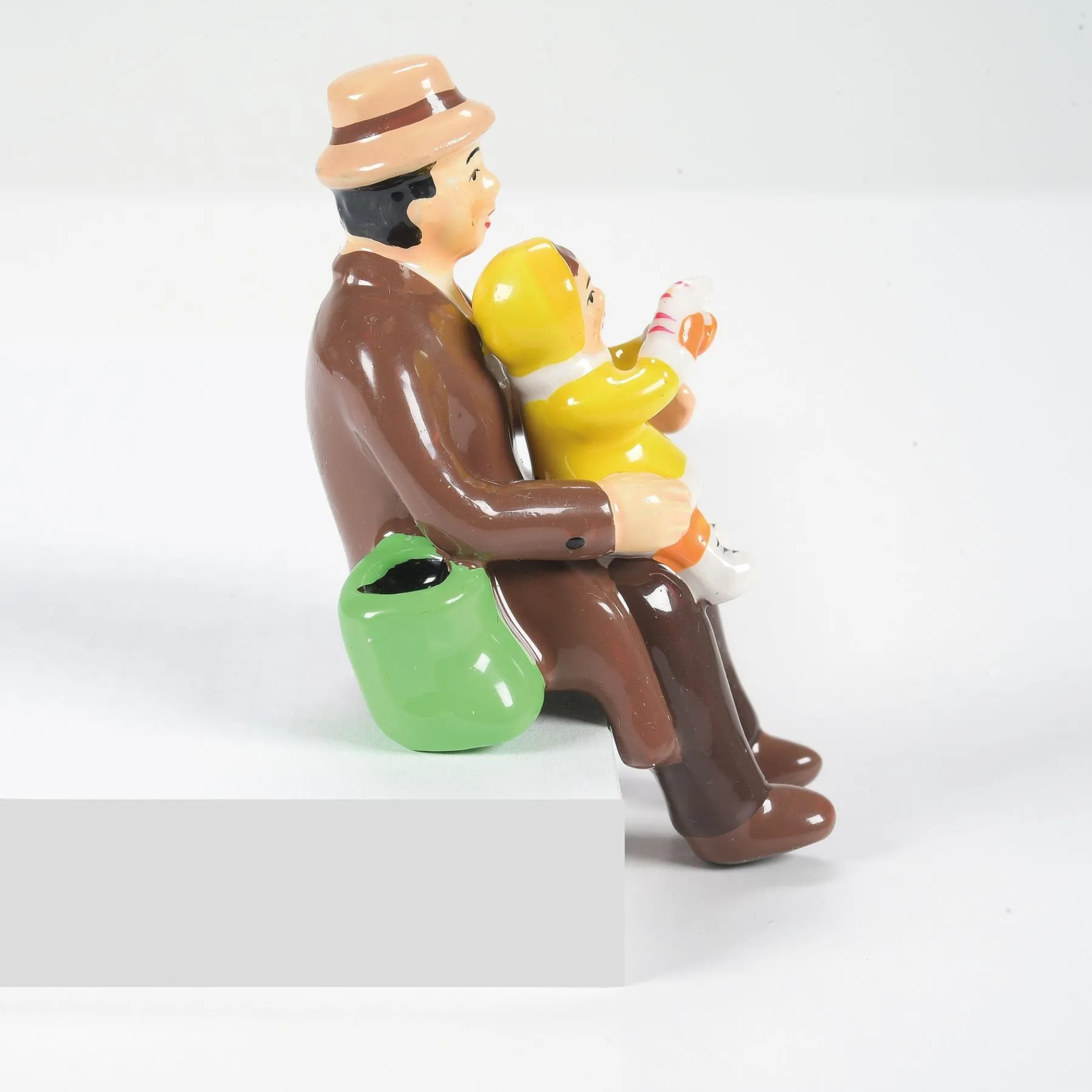 A variety of townspeople all in a seated position to use on park benches or sitting on a low wall. These folks are resting, talking or watching children play.