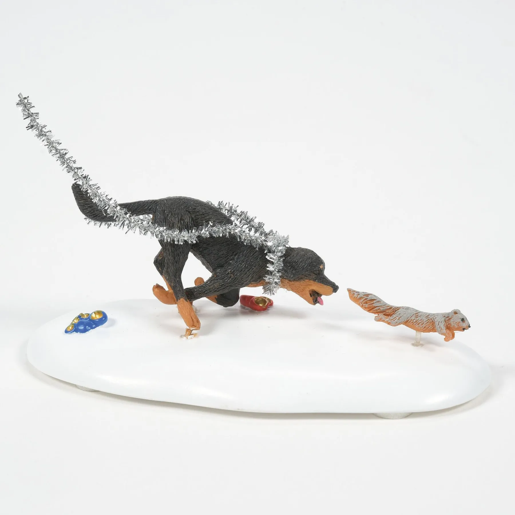 The story is not complete without Snots, Cousin Eddie’s Rottweiler dog. He takes after the squirrel, upsetting the whole front-yard scene!
