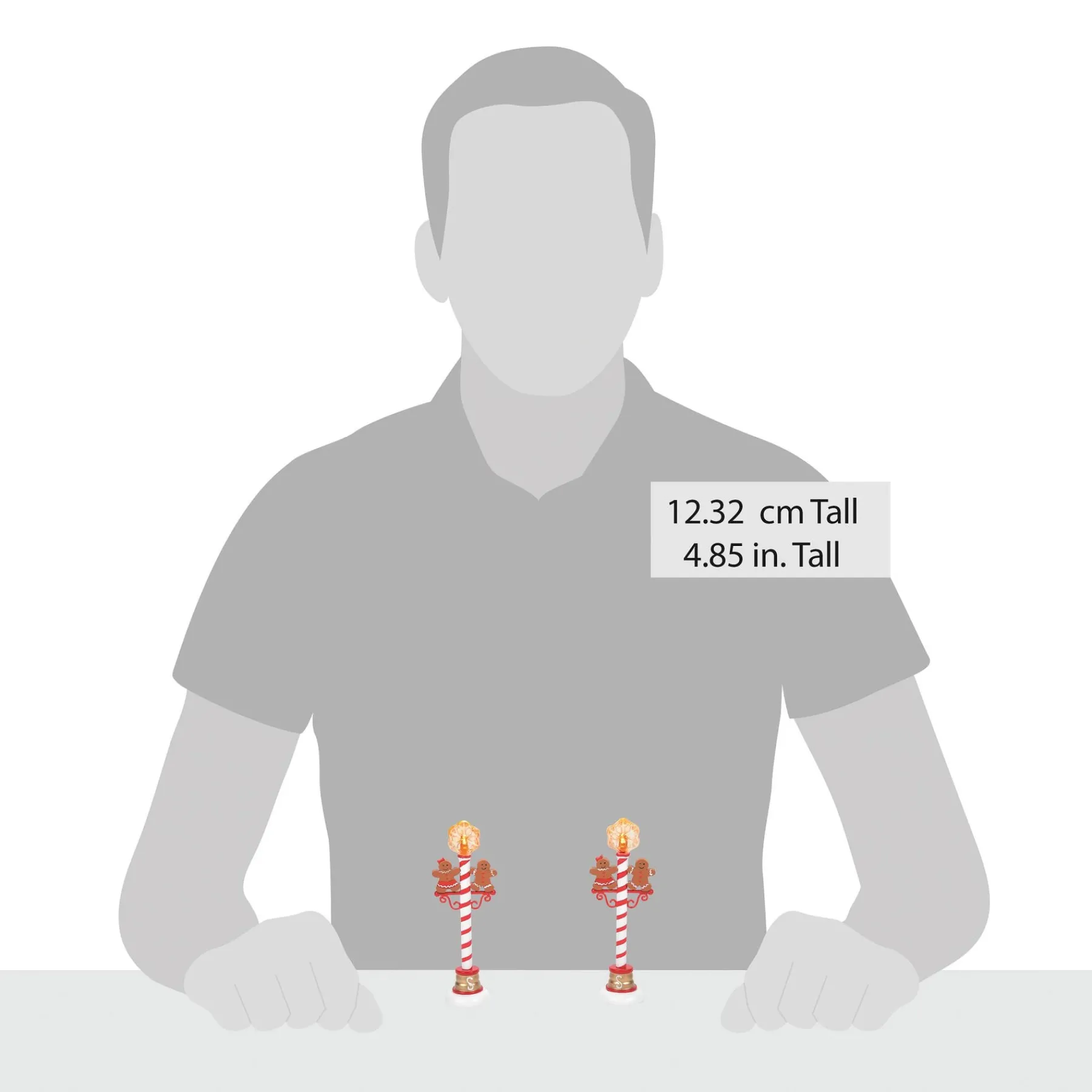 A pair of happy gingerbread figures dance atop these red and white striped street lamps. The lights are covered with LED snowflakes to make the season even brighter.