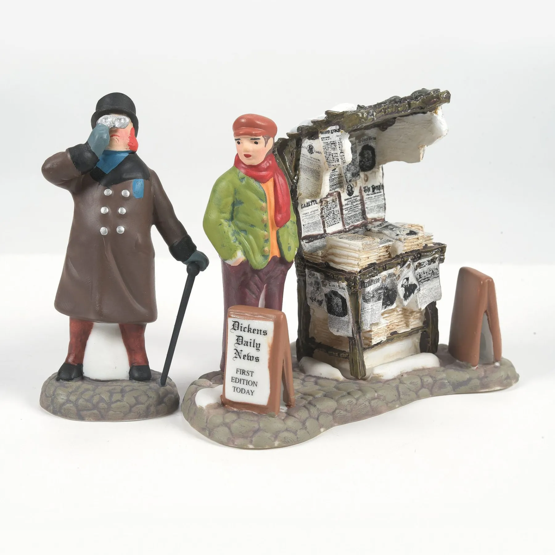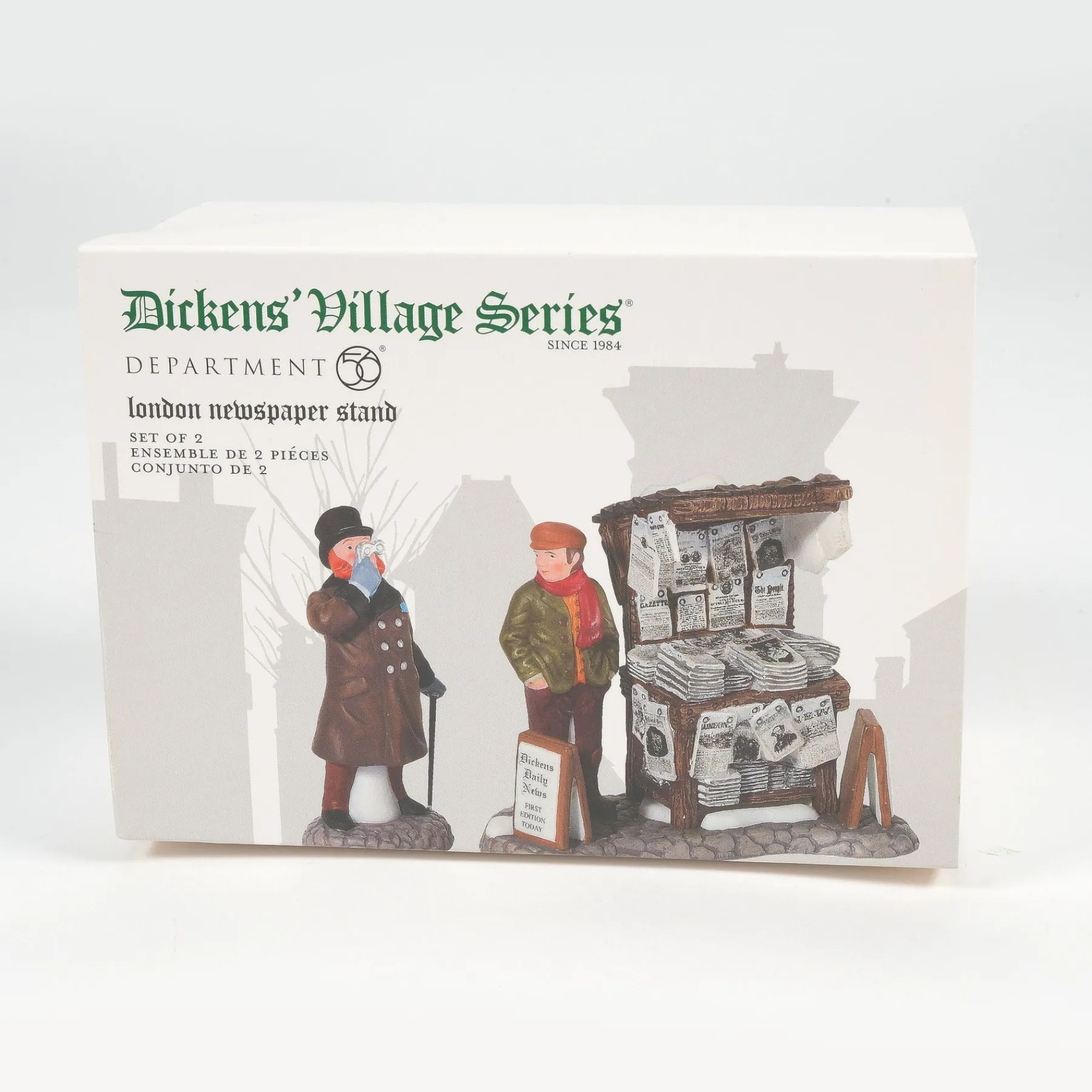 Part of the Dickens’ Village Series; Victorian England, where many traditions we celebrate today took shape. In this set of two a man heads out for his morning newspaper. Hand-crafted & hand-painted porcelain figurine.